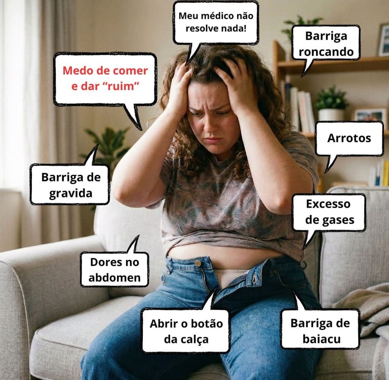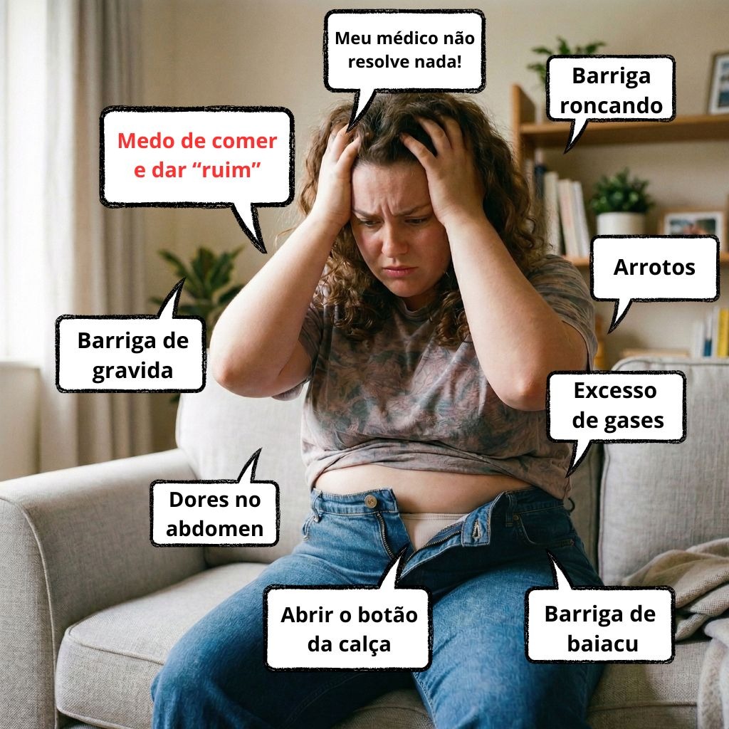 Opção 1: Continuar na mesma, com a barriga de grávida, sentindo desconforto, com muitos gases, arrotando, se perguntando onde está o problema.